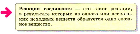 Глава четвёртая. Изменения, происходящие с веществами § 31. Реакции соединенияПонятие «реакции соединения» является антонимом понятия «реакции разложения». Попробуйте, используя приём противопоставления, дать определение понятия «реакции соединения». Верно! У вас получилась следующая формулировка.