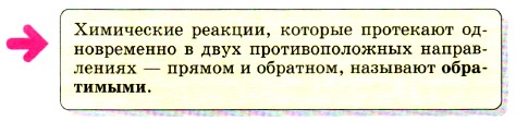 Эта реакция протекает как в прямом направлении, т. е. с образованием продукта реакции, так и в обратном, т. е. происходит разложение продукта реакции на исходные вещества, поэтому в них вместо знака равенства ставят знак обратимости