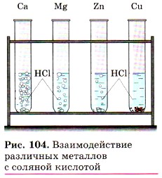 Все ли металлы взаимодействуют с кислотами с образованием соли и водорода? Обратимся к эксперименту. Нальём в четыре одинаковые пробирки равные объёмы соляной кислоты и поместим в них разные металлы: в 1-ю — кусочек кальция, во 2-ю — магния, в 3-ю — цинка, а в 4-ю — меди (рис. 104). Нетрудно заметить, что интенсивность выделения водорода будет уменьшаться от кальция к цинку, а в пробирке с медью газ вообще не выделяется — там не происходит реакция.