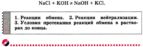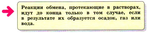 Глава четвёртая. Изменения, происходящие с веществами Реакции обменаА откуда взялся углекислый газ? Вероятно, вы вспомните, что угольная кислота — непрочное соединение, которое распадается на углекислый газ и воду: Н2СO3 = Н2O + СO2↑, поэтому уравнение реакции следует записать так: Na2CO3 + 2HNO3 = 2NaNO3 + Н2O + СO2↑. Сформулируем правило, согласно которому протекают реакции обмена между растворами веществ.