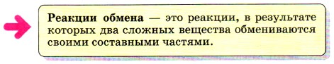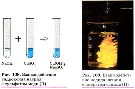 Глава четвёртая. Изменения, происходящие с веществами § 33. Реакции обменаПознакомимся с последним типом реакций по признаку «число и состав исходных веществ и продуктов реакции». В демонстрационную пробирку нальём раствор щёлочи — гидроксида натрия, а затем добавим к нему раствор соли — сульфата меди (II). Выпадет густой синий осадок нерастворимого в воде гидроксида меди (II) (рис. 108). Если небольшую часть содержимого из пробирки, в которой образовался осадок, профильтровать и выпарить несколько капель полученного раствора на часовом стекле, то нетрудно будет заметить появление белых кристалликов соли, образовавшейся в ходе реакции: NaOH + CuSO4 → Cu(OH)2↓ + соль. Чтобы подчеркнуть, что в результате реакции образуется осадок нерастворимого в воде гидроксида меди (II), рядом с его формулой в уравнении реакции записывают стрелку, направленную вниз. Бесспорно, полученная соль может быть только сульфатом натрия Na2SO4: NaOH + CuSO4 → Cu(OH)2↓ + Na2SO4. В результате проведённой реакции два сложных вещества ионного строения — гидроксид натрия и сульфат меди (II) — обменялись своими ионами, т. е. произошла реакция обмена, уравнение которой: 2NaOH + CuSO4 = Cu(OH)2↓ + Na2SO4.
