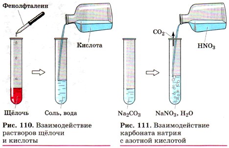 В каждом из двух взаимодействующих растворов была своя среда, соответственно щелочная и кислотная. В результате реакции среда стала нейтральной. Поэтому реакцию обмена между кислотами и щелочами называют реакцией нейтрализации. В демонстрационную пробирку нальём прозрачный бесцветный раствор карбоната натрия и добавим к нему немного раствора азотной кислоты. Признаком химической реакции послужит «вскипание» раствора из-за выделившегося в результате её углекислого газа (рис. 111): соль + кислота → новая соль + новая кислота, Na2CO3 + 2HNO3 = 2NaNO3 + H2CO3.