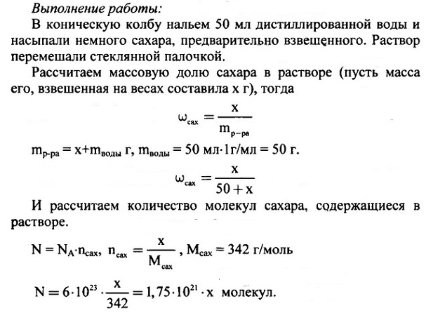 Поскольку сахар СОСТОИТ на 99,9% из сахарозы, имеющей формулу С12Н22О11, вы легко рассчитаете молярную массу сахара и затем найдёте число молекул сахара в полученном вами растворе. Практическая работа № 5. Приготовление раствора сахара и расчёт его массовой доли в растворе. Ответ