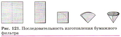 Запрещается встряхивать пробирку, закрывая отверстие пальцем. Во-первых, попадание любых количеств химических реактивов на кожу опасно; во-вторых, при этом в пробирку могут попасть загрязнения, и опыт не получится. Перемешивание растворов в пробирке производят быстрыми энергичными движениями (постукиваниями), как показано на рисунке 119. В колбе содержимое перемешивают круговыми движениями, а в стакане — стеклянной палочкой, надев на её конец отрезок резиновой трубки, чтобы не повредить стенку стакана. Для переливания жидкостей из широкогорлой посуды в сосуд с узким горлом применяют воронки (рис. 120). Их используют и для фильтрования. В этом случае в воронку вкладывают бумажный фильтр (кружок фильтровальной бумаги), который вырезают по размеру воронки.