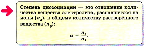 Степень диссоциации электролита определяют опытным путём и выражают в долях или в процентах. Если α = 0, то диссоциация отсутствует, а если α = 1, или 100%, то электролит полностью распадается на ионы. Электролиты имеют различную степень диссоциации, т. е. степень диссоциации зависит от природы электролита. Она также зависит и от концентрации: с разбавлением раствора степень диссоциации увеличивается. По степени электролитической диссоциации электролиты разделяют на сильные и слабые. Cильные электролиты при растворении в воде практически полностью диссоциируют на ионы. У таких электролитов значение степени диссоциации стремится к единице в разбавленных растворах. К сильным электролитам относят: 1) практически все соли; 2) сильные кислоты, например: H2SO4, HCl, HNO3; 3) все щёлочи, например: NaOH, КОН. Слабые электролиты при растворении в воде почти не диссоциируют на ионы. У таких электролитов значение степени диссоциации стремится к нулю. К слабым электролитам относят: 1) слабые кислоты, например: H2S, H2CO3, HNO2; 2) водный раствор аммиака NH3 • Н2O.