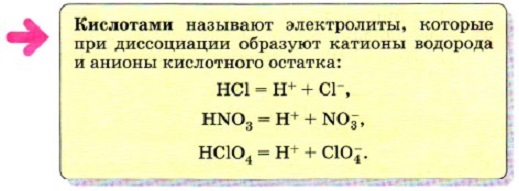 По характеру образующихся при диссоциации электролитов ионов различают три типа электролитов: кислоты, основания и соли.