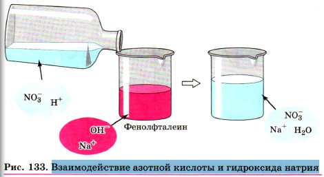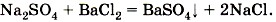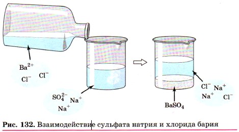 При составлении ионных уравнений следует руководствоваться тем, что формулы веществ малодиссоциирующих, нерастворимых и газообразных записывают в молекулярном виде. Если вещество выпадает в осадок, то, как вы уже знаете, рядом с его формулой ставят стрелку, направленную вниз (↓), а если в ходе реакции выделяется газообразное вещество, то рядом с его формулой ставят стрелку, направленную вверх (↑). Например, если к раствору сульфата натрия Na2SO4 прилить раствор хлорида бария ВаСl2 (рис. 132), то в результате реакции образуется белый осадок сульфата бария BaSO4. Запишем молекулярное уравнение реакции: