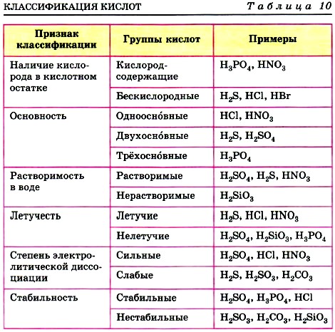 Глава пятая. Растворение. Растворы. Реакции ионного обмена и окислительно-восстановительные реакции § 39. Кислоты, их классификация и свойстваРазделение кислот на группы по различным признакам представлено в таблице 10.
