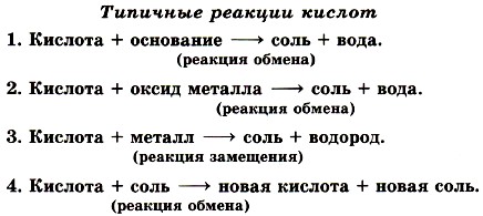 При обычных условиях кислоты могут быть твёрдыми (фосфорная Н3РO4, кремниевая H2SiO3) и жидкими (в чистом виде жидкостью будет серная кислота H2SO4). Такие газы, как хлороводород НСl, бромоводород НВr, сероводород H2S, в водных растворах образуют соответствующие кислоты. Вы уже знаете, что угольная Н2СO3 и сернистая H2SO3 кислоты существуют только в водных растворах, так как являются слабыми и нестойкими. Они легко разлагаются на оксиды углерода (IV) и серы (IV) — СO2 и SO2 соответственно — и воду. Поэтому выделить эти кислоты в чистом виде невозможно. Часто путают понятия «летучесть» и «устойчивость» (стабильность). Летучими называют кислоты, молекулы которых легко переходят в газообразное состояние, т. е. испаряются. Например, соляная кислота является летучей, но устойчивой, стабильной кислотой; нелетучая нерастворимая кремниевая кислота при стоянии разлагается на воду и оксид кремния (IV) SiO2. Водные растворы соляной, азотной, серной, фосфорной и ряда других кислот не имеют окраски. Водные растворы хромовой кислоты Н2СrO4 имеют жёлтую окраску, марганцевой кислоты НМnO4 — малиновую. Однако, какими бы разными ни были кислоты, все они образуют при диссоциации катионы водорода, которые и обусловливают ряд общих свойств: кислый вкус, изменение окраски индикаторов (лакмуса и метилового оранжевого), взаимодействие с другими веществами.