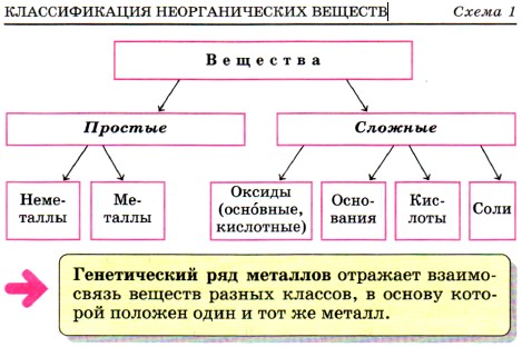 Вначале наши сведения о классификации веществ представим в виде схемы (схема 1). Зная классы простых веществ, можно составить два генетических ряда: генетический ряд металлов и генетический ряд неметаллов.