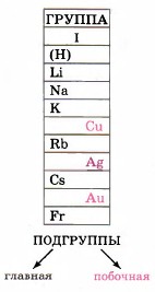 По вертикали химические элементы, «живущие» в сходных по свойствам «квартирах», располагаются друг под другом в вертикальных столбцах — группах, которых в таблице Д. И. Менделеева восемь. Каждая группа состоит из двух подгрупп — главной и побочной. Подгруппу, в которую входят элементы и малых, и больших периодов, называют главной подгруппой или группой А. Подгруппу, в которую входят элементы только больших периодов, называют побочной подгруппой или группой В. Так, в главную подгруппу I группы (IA группы) входят литий, натрий, калий, рубидий и франций — это подгруппа лития Li; побочная подгруппа этой группы (IB группы) образована медью, серебром и золотом — это подгруппа меди Си. Кроме формы таблицы Д. И. Менделеева, которая называется короткопериодной (она приведена на форзаце учебника), существует множество других форм, например длиннопериодный вариант (рис. 25). Подобно тому как из элементов игры «Лего» ребёнок может сконструировать огромное количество различных предметов (см. рис. 10 на с. 17), так и из химических элементов природа и человек создали окружающее нас многообразие веществ. Ещё нагляднее другая модель: подобно тому как 33 буквы русского алфавита образуют различные комбинации, десятки тысяч слов, так и 114 химических элементов в различных сочетаниях создают более 20 миллионов различных веществ. Постарайтесь усвоить закономерности образования слов — химических формул, и тогда мир веществ откроется перед вами во всём своём красочном многообразии. Но для этого вначале выучите буквы — символы химических элементов (табл. 1).