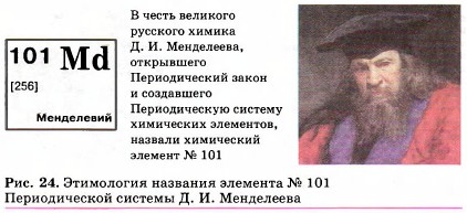Введение Периодическая система химических элементов Д. И. Менделеева. Знаки химических элементовНаконец, в названиях элементов увековечены имена великих учёных: кюрий, фермий, эйнштейний, менделевий (рис. 24), лоуренсий. Каждому химическому элементу отведена в таблице Менделеева, в общем «доме» всех элементов, своя «квартира» — клетка со строго определённым номером. Глубокий смысл этого номера вам раскроется при дальнейшем