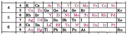 Периоды 4, 5 и 6-й включают по два ряда элементов, их называют большими периодами; 4-й и 5-й периоды содержат по 18 элементов, 6-й — 32 элемента.