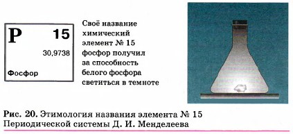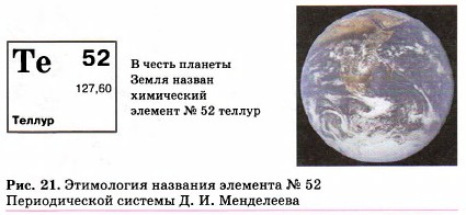 С их помощью вы научитесь писать слова — химические формулы, а на их основе сможете записывать предложения — уравнения химических реакций. Каждый химический элемент обозначают собственным химическим знаком, или символом, который наряду с названием химического элемента записан в таблице Д. И. Менделеева. В качестве символов по предложению шведского химика Й. Берцелиуса были приняты в большинстве случаев начальные буквы латинских названий химических элементов. Так, водород (латинское название Hydrogenium — гидрогениум) обозначают буквой Н (читают «аш»), кислород (латинское название Oxygeniит — оксигениум) — буквой О (читают «о»), углерод (латинское название Carboneum — карбонеум) — буквой С (читают «цэ»). На букву С начинаются латинские названия ещё нескольких химических элементов: кальция (Calcium), меди (Cuprum), кобальта (Cobaltum) и др. Чтобы их различить, И. Берцелиус предложил к начальной букве латинского названия добавлять ещё одну из последующих букв названия. Так, химический знак кальция записывают символом Са (читают «кальций»), меди — Си (читают «купрум»), кобальта — Со (читают «кобальт»), В названиях одних химических элементов отражены важнейшие свойства элементов, например, водород — рождающий воду, кислород — рождающий кислоты, фосфор — несущий свет (рис. 20) и т. д. Другие элементы названы в честь небесных тел или планет Солнечной системы — селен и теллур (рис. 21)