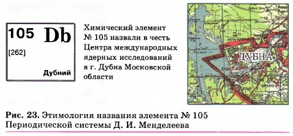 Некоторые элементы были названы в честь различных государств или частей света. Например, германий, галлий (Галлия — старинное название Франции), полоний (в честь Польши), скандий (в честь Скандинавии), франций, рутений (Рутения — латинское название России), европий и америций. Вот элементы, названные в честь городов: гафний (в честь Копенгагена), лютеций (в старину Париж называли Лютеций), берклий (в честь города Беркли в США), иттрий, тербий, эрбий, иттербий (названия этих элементов происходят от Иттерби — маленького города в Швеции, где впервые был обнаружен минерал, содержащий эти элементы), дубний (рис. 23).