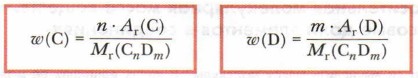 Например: Mr(NH3) = Аr(N) • 1 + Ar(Н) • 3 = 14 • 1 + 1 • 3 = 17 Мr(Н3РO4) = Ar(Н) • 3 + Ar(Р) • 1 + Ar(О) • 4 = 1 • 3 + 31 • 1 + 16 • 4 = 98 Используя атомные единицы массы (а. е. м.), можно выразить массу отдельных молекул веществ (обозначается mм): mм(NH3) = ma(N) • 1 + ma(Н) • 3 = 14 а. е. м. • 1 + 1 а. е. м. • 3 = 17 а. е. м. mм(Н3РO4) = mа(Н) • 3 + mа(Р) • 1 + ma(О) • 4 = 1 а. е. м. • 3 + 31 а. е. м. • 1 + 16 а. е. м. • 4 = 98 а. е. м. Относительная молекулярная масса — величина безразмерная. Ее нё следует путать с истинной массой молекул, выражаемой в а. е. м. По химическим формулам можно также вычислить массовые доли элементов в химических соединениях. Массовая доля элемента (обозначается латинской буквой Массовые доли элементов могут быть выражены в долях единицы или в процентах. Разумеется, при определении массовых долей элементов следует учитывать число их атомов в молекуле. Например , для вещества состава CnDm