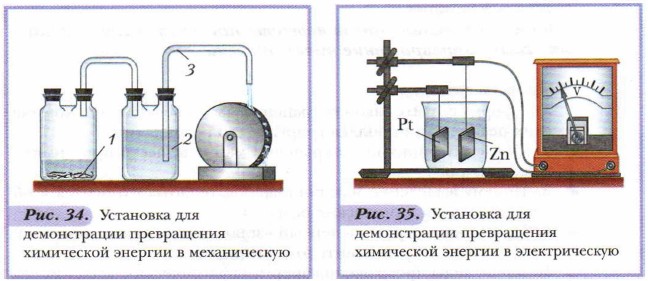 Например, при реакции цинка с серной кислотой (рис. 34, 1) выделяется водород, вытесняющий воду из банки (рис. 34, 2) и заставляющий воду подниматься вверх по трубке (рис. 34, 3). Выливающаяся вода совершает работу — приводит в движение колёсико с лопастями.