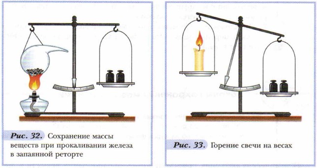 Проблема. Перед прокаливанием запаянная реторта с железом была взвешена. После нагревания сосуд был открыт и вновь взвешен. Почему его масса увеличилась? Приведите ваши объяснения и доказательства. Закон сохранения массы веществ проявляется во всех химических реакциях и всегда может быть подтверждён экспериментально. Например, при горении свечи кажется, что масса веществ убывает (рис. 33), однако если произвести поглощение продуктов реакции горения и взвесить их вместе с огарком свечи, то масса веществ получится такой же, как и до начала реакции.