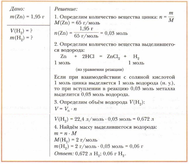 Задача 3Определить объём (при н. у.) и массу водорода, который выделится при взаимодействии 1,95 г цинка с соляной кислотой.