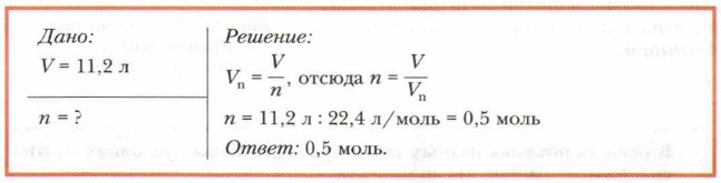 Глава 5. Понятие о газах. Воздух. Кислород. Горение Законы Гей-Люссака и АвогадроПроведём некоторые простые расчёты на основании закона АвогадроI. Определение количества вещества в газе, занимающем известный объём при н. у., и определение объёма газа по известному количеству вещества Задача 1 (прямая)Определить количество вещества в газе, заполняющем при н. у. сосуд объёмом 11,2 л.