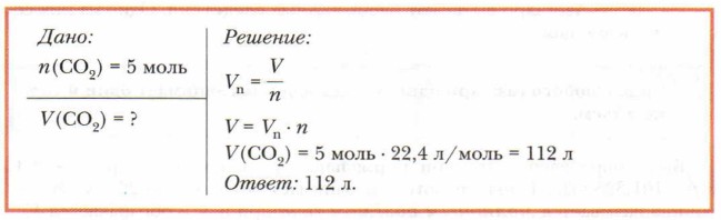 Задача 2 (обратная)Какой объём займёт углекислый газ количеством вещества 5 моль (н. у.)?