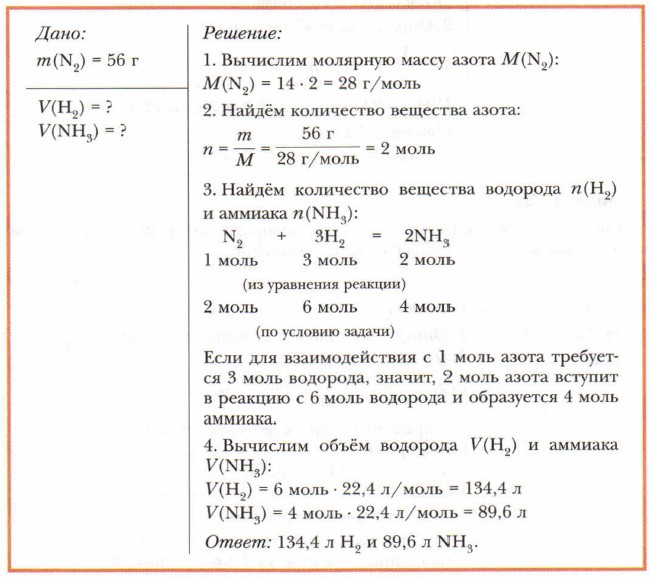 Задача 1Какой объём водорода (н. у.) потребуется для взаимодействия с азотом, масса которого 56 г? Каков объём образующегося при этом аммиака (н. у.)?