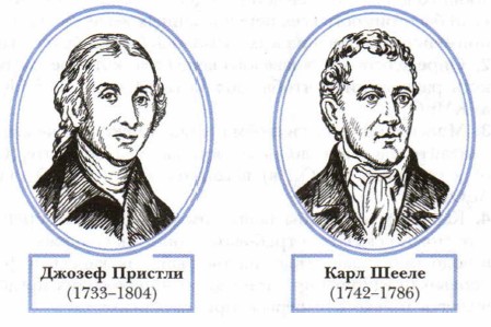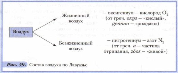 Впрочем, замечание «ранее неизвестный» не точно. Китайцы описали кислород ещё в VIII в. В Европе изобретатель подводной лодки Корнелиус Дреббель в начале XVII в. выделил кислород, выяснил его роль в дыхании и использовал на своей подводной лодке. К сожалению, это открытие, сделанное в военных целях, оказалось неизвестно химикам и никак не было использовано для развития науки. По-настоящему оценил этот газ (и дал ему название) французский химик Антуан Лоран Лавуазье. Он узнал об опытах от самого Пристли. Результаты опытов Пристли помогли великому французскому учёному продолжить исследование процессов горения и дать им научное объяснение. Лавуазье оказал химии неоценимую услугу, создав теорию кислородного горения. Одновременно учёный сделал первые шаги в области выяснения состава воздуха. До встречи с Пристли Лавуазье не учитывал того, что в процессах горения и дыхания участвует только часть воздуха — кислород. Во вновь поставленных опытах, по ходу которых проводились возможно более точные количественные измерения, Лавуазье установил, что воздух состоит из двух частей, обладающих противоположными свойствами (рис. 59).