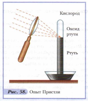Дополнительный материал к § 28 История открытия кислородаКислород почти одновременно был открыт двумя выдающимися химиками: англичанином Джозефом Пристли и шведом Карлом Шееле. Пристли так описал своё открытие: «Достав линзу диаметром два дюйма и фокусным расстоянием двадцать дюймов, я начал исследовать с её помощью, какой род воздуха выделяется из разнообразнейших веществ, естественных и искусственно приготовленных. После ряда других опытов 1 августа 1774 года я попытался извлечь воздух из ртутной окалины и нашёл, что воздух легко может быть изгнан из неё посредством линзы. Этот воздух не поглощался водой. Каково же было моё изумление, когда я обнаружил, что свеча горит в этом воздухе необычайно ярким пламенем. Тщетно я пытался найти объяснение этому явлению». Как видно из описания опыта, линза использовалась учёным для получения высокой температуры (путём фокусирования солнечных лучей). При сильном нагревании свинцовой и ртутной окалины Пристли получил ранее неизвестный газ (рис. 58).
