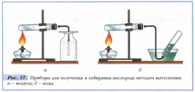 Практическая работа 5 Получение кислорода и изучение его свойствЦель работы: ознакомиться со способом получения кислорода в лаборатории и его свойствами, научиться работать с прибором для получения газов и собирать газ способами вытеснения воды и воздуха, закрепить навыки работы с нагревательными приборами. Ход работы1. В сухую пробирку поместите перманганат калия (примерно 1 см3), вложите около отверстия пробирки небольшой рыхлый комочек ваты (он задерживает частицы перманганата при его нагревании). Закройте пробирку пробкой с газоотводной трубкой. Проверьте прибор на герметичность! Для этого зажмите пробирку в ладони, опустите конец трубки в стакан с водой. Если из газоотводной трубки пробулькивают пузырьки воздуха, то прибор герметичен. Закрепите прибор в штативе в горизонтальном положении и опустите конец газоотводной трубки в стакан почти до его дна. 2. Начинайте нагревание. Сначала прогрейте всю пробирку, затем установите спиртовку под ту часть пробирки, где находится перманганат калия. Соберите кислород вытеснением воздуха из стакана (см. рис. 57, а). Наличие кислорода можно проверить, поднеся тлеющую лучинку к отверстию стакана. Что наблюдаете? Почему? Прекратите нагревание и закройте стакан картонным кружком. 3. Возьмите уголёк тигельными щипцами, раскалите его в пламени спиртовки и быстро внесите в стакан с кислородом. Что наблюдаете? 4. Наденьте на конец газоотводной трубки стеклянный наконечник и соберите прибор для получения кислорода вытеснением воды (см. рис. 57, б). Снова нагрейте перманганат калия и соберите кислород в перевёрнутую пробирку, заполненную водой. Внимание! Сначала выньте из воды газоотводную трубку и только потом прекратите нагревание! Наличие кислорода проверьте тлеющей лучинкой.