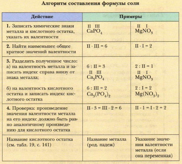 Примеры: KNO3, Na2SO4, Mg3(PO4)2. Формулы солей составляют на основании учёта валентности металла и кислотного остатка. Рассмотрим примеры составления формул и названий солей.