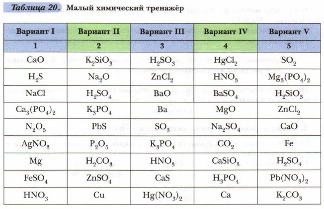 а) определите принадлежность каждого соединения к одному из классов неорганических соединений; б) назовите каждое вещество; в) определите валентность кислотных остатков в формулах солей и кислот; г) определите растворимость соединений по таблице растворимости; д) проверьте себя: сколько веществ из перечисленных в данном варианте вам хорошо знакомы (т. е. вы можете описать их физические свойства).