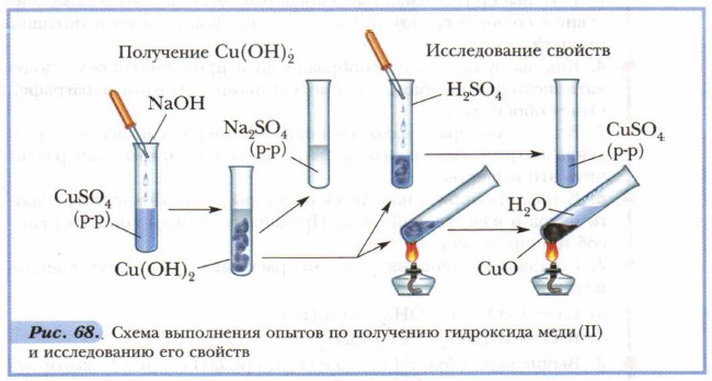 Для нерастворимых оснований характерны два общих свойства: они растворяются в растворах сильных кислот и разлагаются при нагревании (в отличие от щелочей) на соответствующий оксид и воду. Подтвердим существование этих свойств с помощью лабораторных опытов. Последовательность опытов представлена на рисунке 68.