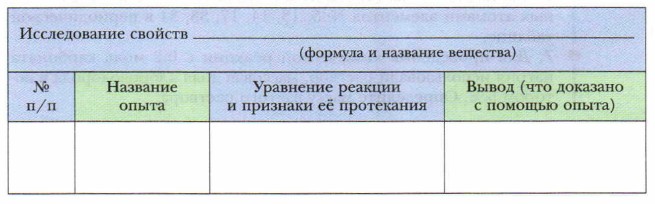 Практическая работа 6 Исследование свойств оксидов, кислот, основанийЦель работы: научиться экспериментально характеризовать химические свойства неорганических веществ основных классов, закрепить умение составлять план исследования свойств вещества, отработать навыки обращения с лабораторным оборудованием. Работа проводится по вариантам: I вариант — оксид меди (II) II вариант — серная кислота (5 %-й раствор) III вариант — гидроксид калия IV вариант — соляная кислота (3 %-й раствор) V вариант — гидроксид железа(III) VI вариант — оксид фосфора (V) Порядок выполнения работы 1. Получите задание с указанием номера варианта. 2. Запишите в тетради тему занятия и номер варианта. 3. Определите, к какому классу неорганических веществ относится выданное вам вещество, и составьте план изучения его химических свойств. 4. Проверьте наличие на рабочем месте необходимого оборудования и реактивов для проведения опытов по плану. 5. Ознакомьтесь с правилами техники безопасности при работе с кислотами, щелочами и нагревательными приборами (с. 12-16, 141, 152). 6. Выполните опыты по составленном) вами плану. 7. Оформите в тетради отчёт согласно предложенной таблице.