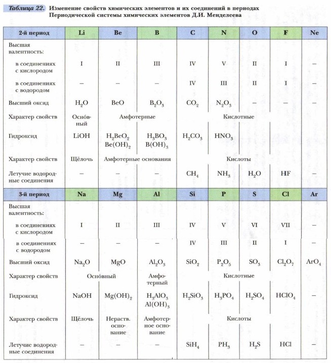 Задание. Пользуясь таблицей 22, выявите периодические изменения свойств элементов, а также форм и свойств их соединений с возрастанием порядкового номера с № 1 по № 20.
