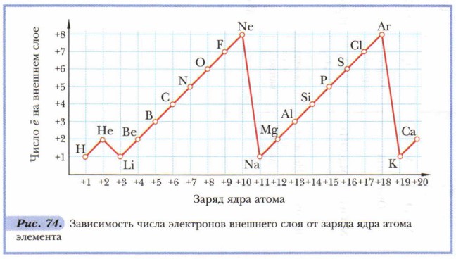На основе проделанного анализа выведем закономерности изменения свойств элементов с увеличением их порядкового номера: Проблема. Какова зависимость между характеристиками элемента, меняющимися монотонно и периодически? Рассмотрим эту связь на примере заряда ядра атомов и их внешних электронов. Для этого построим график (рис. 74). Отметим на горизонтальной линии заряд ядра атома (Z), а на вертикальной — число электронов на внешнем слое атомов элементов.