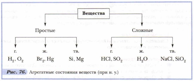 Из курсов физики и химии вы познакомились с разным агрегатным состоянием веществ (рис. 76) — газообразным (г.), жидким (ж.), твёрдым (тв.), переходами их из одного состояния в другое. Задание 1. Приведите примеры газообразных, жидких и твёрдых веществ. Приведите примеры твёрдых веществ с ковалентной и ионной связями. Приведите примеры переходов веществ из одного состояния в другое.
