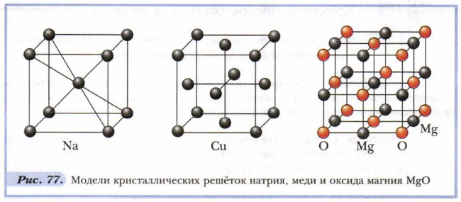 Форму кристалла изучает наука кристаллография. Внутреннее строение кристаллов и взаимозависимость свойств веществ связаны с их кристаллической структурой (см. рис. 20, 21, с. 33). Внутреннее строение кристаллов характеризует их кристаллическая решётка (рис. 77).