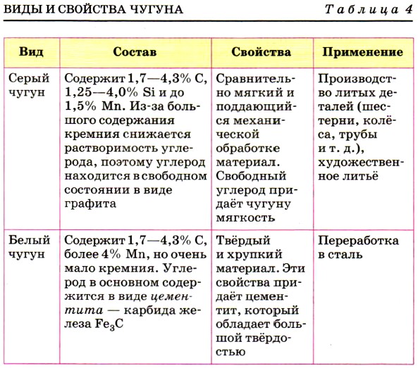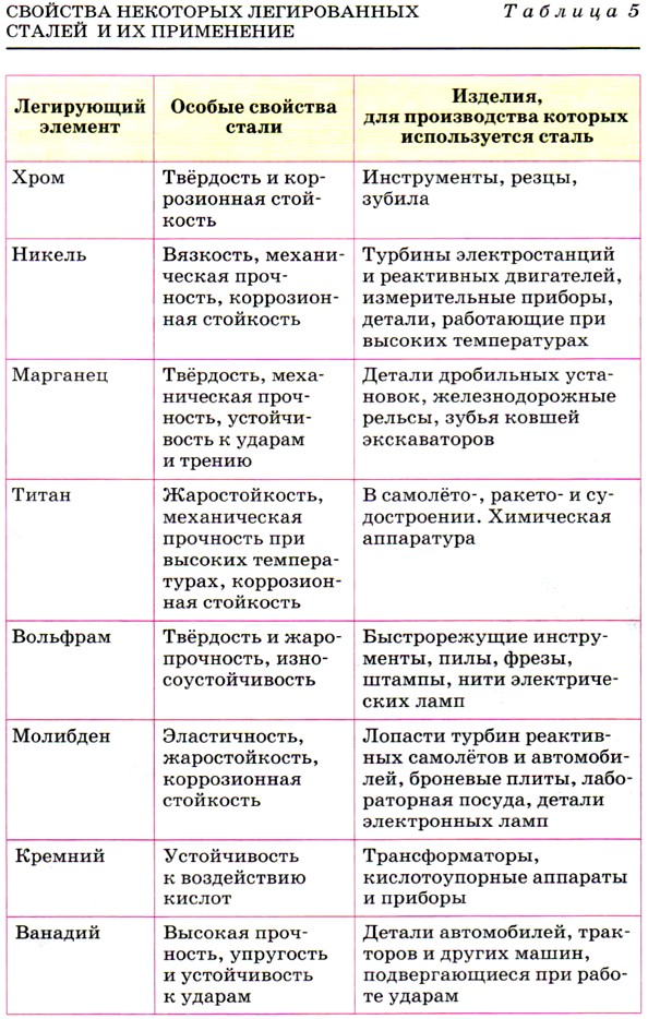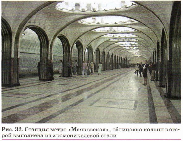 В зависимости от состояния углерода в сплаве различают серый и белый чугун (табл. 4). Сталь — сплав на основе железа, содержащий менее 2% углерода. По химическому составу стали разделяют на два основных вида: углеродистая и легированная. Углеродистая сталь представляет собой сплав железа главным образом с углеродом, но, в отличие от чугуна, содержание в ней углерода, а также марганца, кремния, фосфора и серы гораздо меньше. В зависимости от количества углерода стали подразделяют на мягкие (содержание углерода не превышает 0,3%), средней твёрдости (углерода несколько больше, чем в мягких) и твёрдые (углерода может быть до 2%). Из стали мягкой и средней твёрдости делают детали машин, трубы, болты, гвозди, скрепки и т. д., а из твёрдой — различные инструменты и посуду. Легированная сталь — это тоже сплав железа с углеродом, только в него введены специальные, легирующие добавки: хром, никель, вольфрам, молибден, ванадий и др. Легирующие добавки придают сплаву особые качества. Так, хромоникелевые стали очень пластичные, прочные, жаростойкие, кислотоупорные, устойчивые против коррозии (ржавления). Их применяют в строительстве (например, облицовка колонн станции «Маяковская» московского метро выполнена из хромоникелевой стали (рис. 32)), а также для изготовления нержавеющих предметов домашнего обихода (ножей, вилок, ложек), всевозможных медицинских и других инструментов. Хромомолибденовые и хромованадиевые стали очень твёрдые, прочные и жаростойкие. Их используют для изготовления трубопроводов, компрессоров, двигателей и многих других деталей машин современной техники. Хромовольфрамовые стали сохраняют большую твёрдость при очень высоких температурах. Они служат конструкционным материалом для быстрорежущих инструментов. Свойства некоторых легированных сталей и области их применения представлены в таблице 5.