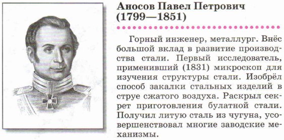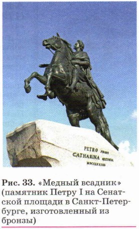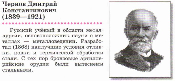 Стали — это основа современного машиностроения, оборонной промышленности, ракетостроения и других отраслей промышленности. В развитии современной металлургии стали большое значение имели работы Д. К. Чернова и П. П. Аносова. Из цветных сплавов отметим бронзу, латунь, мельхиор, дюралюминий. Бронза — сплав на основе меди с добавлением (до 20%) олова. Бронза хорошо отливается, поэтому её используют в машиностроении для изготовления подшипников, поршневых колец, клапанов, арматуры и т. д. Используют бронзу также и для художественного литья (рис. 33). Латунь — медный сплав, содержащий от 10 до 50% цинка. Применяют в моторостроении, для изготовления мебельной фурнитуры.
