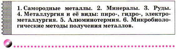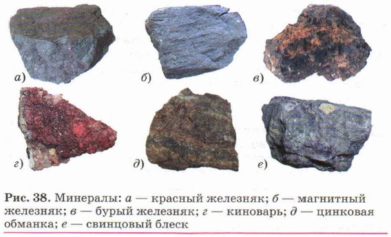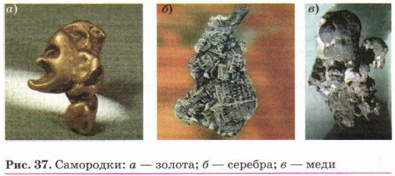 Глава 2. Металлы § 12. Получение металловМеталлы находятся в природе как в свободном виде — самородные металлы, так и в виде различных соединений. В свободном состоянии в природе встречаются такие металлы, которые трудно окисляются кислородом воздуха, например платина, золото, серебро, значительно реже ртуть, медь и др. Самородные металлы обычно содержатся в небольших количествах в виде зёрен или вкраплений в горных породах. Изредка встречаются и довольно крупные куски металлов — самородки (рис. 37). Например, самый крупный самородок меди весил 420 т, серебра — 13,5 т, а золота — 112 кг. Большинство металлов в природе существует в связанном состоянии в виде различных химических природных соединений — минералов (рис. 38). Очень часто это оксиды, например минералы железа: красный железняк Fe2O3, бурый железняк 2Fe2O3 • ЗН2O, магнитный железняк Fe3O4.