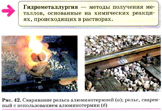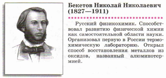 Если в качестве металла-восстановителя используют алюминий, то соответствующий процесс восстановления называют алюминотермией (рис. 42). Этот метод получения металлов был предложен русским учёным Н. Н. Бекетовым.