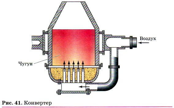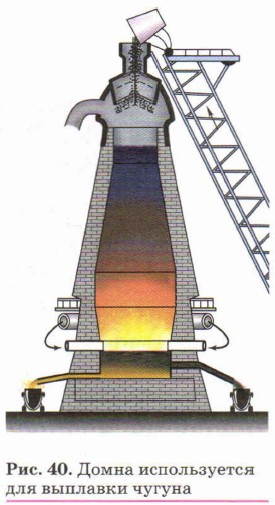 Чугун получают при высоких температурах в металлургических печах, называемых домнами (рис. 40). В свою очередь, из чугуна в других металлургических печах, например конвертерах (рис. 41), выплавляют сталь.