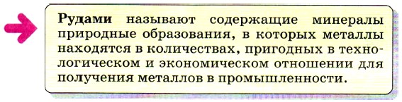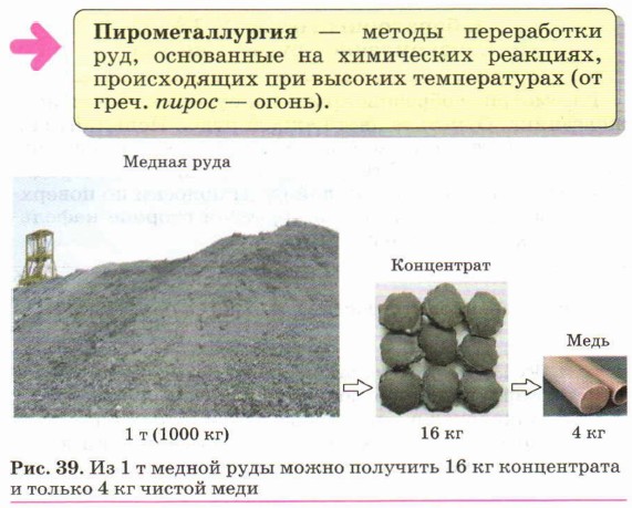 По химическому составу минерала, входящего в руду, различают оксидные, сульфидные и другие руды. Обычно перед получением металлов из руды её предварительно обогащают — отделяют пустую породу, примеси. В результате образуется концентрат, служащий сырьём для металлургического производства (рис. 39).