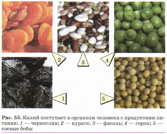 Взрослый человек должен в сутки потреблять с пищей 3,5 г калия. С помощью соединений калия можно устранять отёки. В этом случае нужно увеличить потребление калия до 5 г в сутки. Больше всего калия содержат курага, соя, фасоль, зелёный горошек, чернослив, изюм и некоторые другие продукты (рис. 53). Соли калия широко используют в сельском хозяйстве в качестве калийных удобрений.