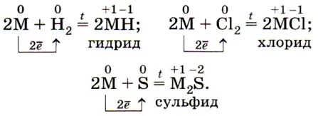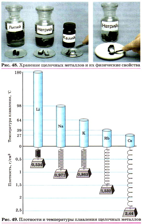 На внешнем энергетическом уровне атомы этих элементов содержат по одному электрону, находящемуся на сравнительно большом удалении от ядра. Они легко отдают этот электрон, поэтому являются очень сильными восстановителями. Во всех своих соединениях щелочные металлы проявляют степень окисления +1. Восстановительные свойства их усиливаются при переходе от Li к Cs, что связано с увеличением радиусов их атомов. Это наиболее типичные представители металлов: металлические свойства выражены у них особенно ярко. Щелочные металлы — простые вещества. Серебристо-белые мягкие вещества (режутся ножом), с характерным блеском на свежесрезанной поверхности (рис. 48). Все они лёгкие и легкоплавкие, причём, как правило, плотность их возрастает от лития к цезию, а температура плавления, наоборот, уменьшается (рис. 49). Щелочные металлы активно взаимодействуют почти со всеми неметаллами. Используя общее обозначение для металлов М, запишем в общем виде уравнения реакций щелочных металлов с неметаллами — водородом, хлором и серой: