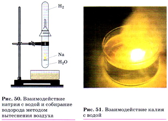 Как вы уже знаете, все щелочные металлы активно взаимодействуют с водой, образуя щёлочи и восстанавливая воду до водорода (рис. 50 и 51):