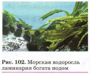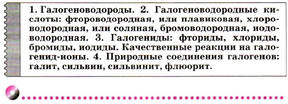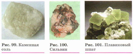 Важнейшее природное соединение хлора — галит NaCl (рис. 99), с ним вы подробно знакомились в прошлом году. Галит добывают путём разработки залежей каменной соли — твёрдого хлорида натрия. Кроме галита, встречается природный хлорид калия КСl. Это минералы сильвин (рис. 100) и сильвинит (смесь КСl и NaCl, состав которой отражают формулой KCl • NaCl). Природный минерал фтора — это флюорит, или плавиковый шпат CaF2 (рис. 101). Бром и иод — рассеянные элементы и своих минералов не образуют. Эти элементы концентрируются в водах океанов и морей, в водах буровых скважин, а также в водорослях (рис. 102).