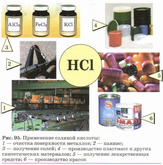 Необратимому протеканию этой реакции способствует летучесть НСl. Соляная кислота представляет собой бесцветную, дымящуюся на воздухе жидкость, которая несколько тяжелее воды. Это типичная кислота, взаимодействует с металлами, оксидами и гидроксидами металлов и солями (приведите уравнения соответствующих реакций и охарактеризуйте их в свете теории электролитической диссоциации и процессов окисления и восстановления там, где это имеет место). Соляная кислота находит широкое применение в промышленности (рис. 95). Соли галогеноводородных кислот. Галогеноводородные кислоты образуют соли: фториды, хлориды, бромиды и иодиды. Хлориды, бромиды и иодиды многих металлов хорошо растворимы в воде. Для определения в растворе хлорид-, бромид- и иодид-ионов и их различения используют реакцию с нитратом серебра AgNO3 (рис. 96). В результате реакции хлоридов (и самой соляной кислоты) с этим реактивом выпадает белый творожистый осадок хлорида серебра AgCl, сокращённое ионное уравнение этой реакции записывается так:
