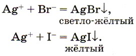 В реакциях с бромоводородной кислотой и её солями и с иодоводородной кислотой и её солями также образуются осадки, но только жёлтого цвета, которые различаются оттенками: