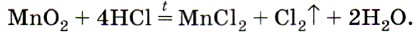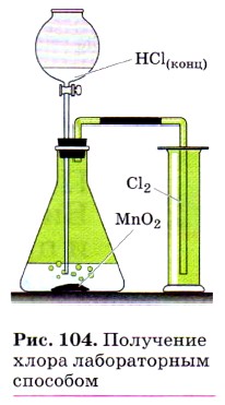 В лаборатории (рис. 104) хлор получают взаимодействием соляной кислоты с оксидом марганца:
